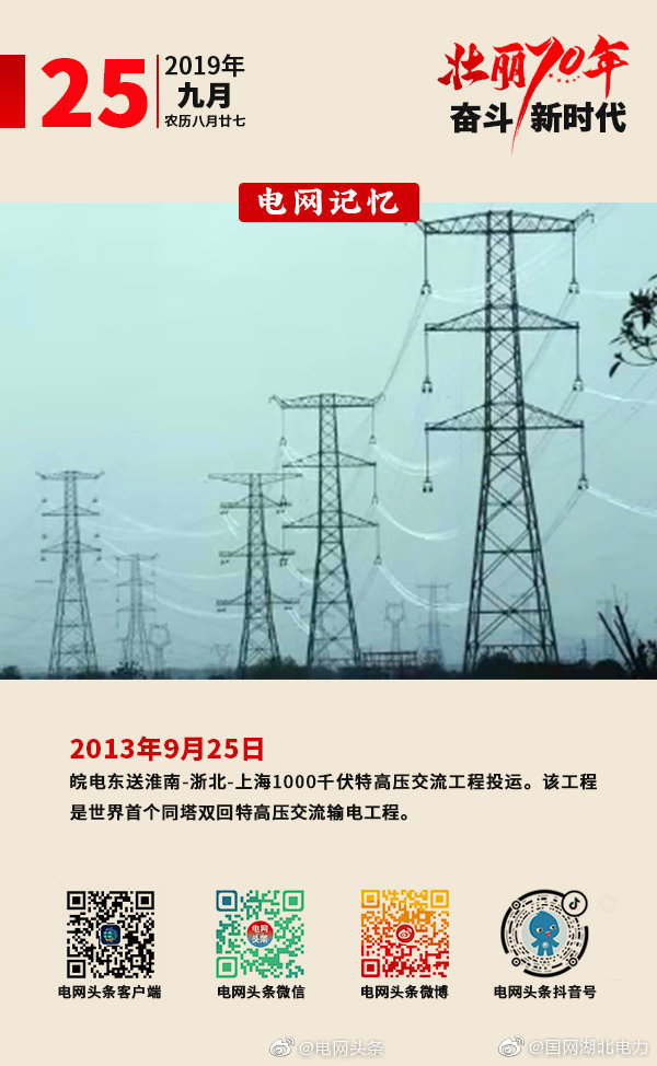 2013年9月25日,皖電東送淮南—浙北—上海1000千伏特高壓交流工程投運。該工程是世界首個同塔雙回特高壓交流輸電工程。