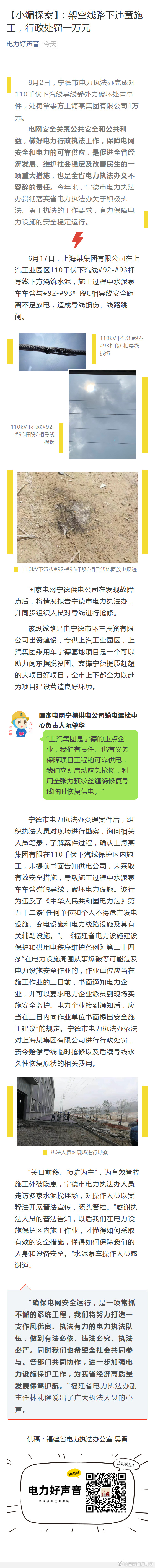 【架空線路下違章施工,行政處罰一萬元】電網(wǎng)安全關(guān)系公共安全和公共利益,做好電力行政執(zhí)法工作,保障電網(wǎng)安全和電力的可靠供應(yīng),是促進(jìn)全省經(jīng)濟(jì)發(fā)展、維護(hù)社會(huì)穩(wěn)定及改善民生的一項(xiàng)重大措施,也是全省電力執(zhí)法辦義不容辭的責(zé)任。今年來,寧德市電力執(zhí)法辦貫徹落實(shí)省電力執(zhí)法辦關(guān)于積極執(zhí)法、勇于執(zhí)法的工作要求,有力保障電力設(shè)施的安全穩(wěn)定運(yùn)行。